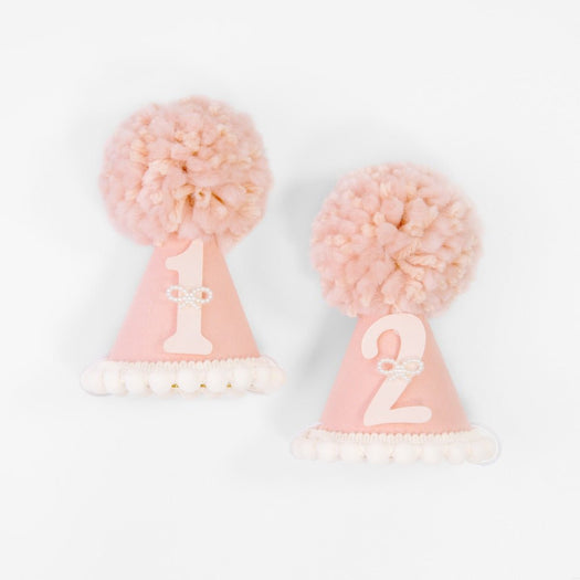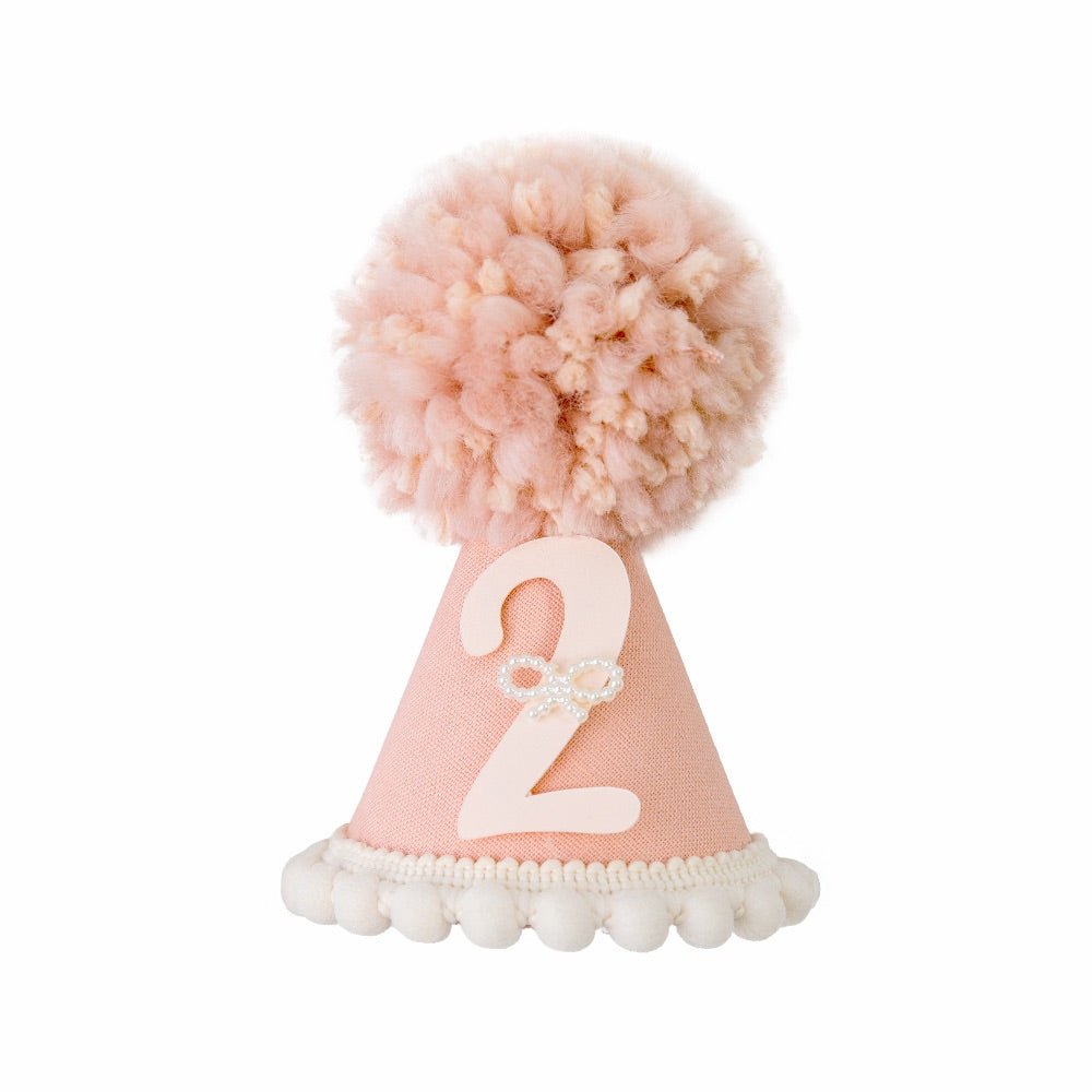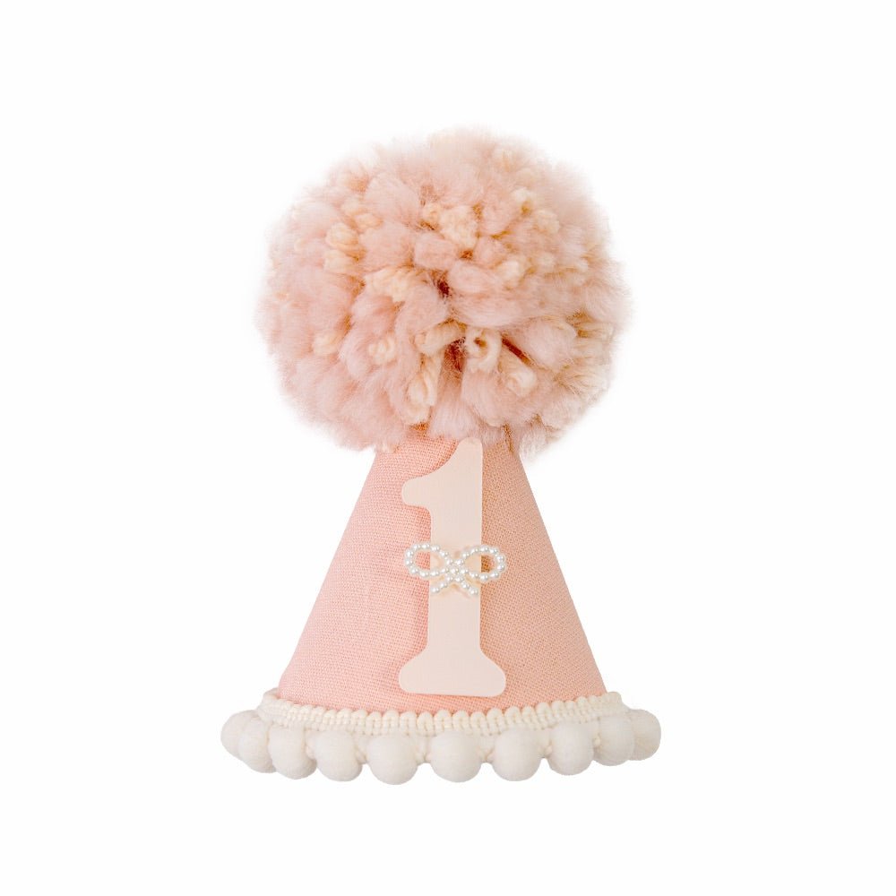 Blush pink hat with light pink detailed trim and number. Pearl bow detail and oversized pom pom on top.