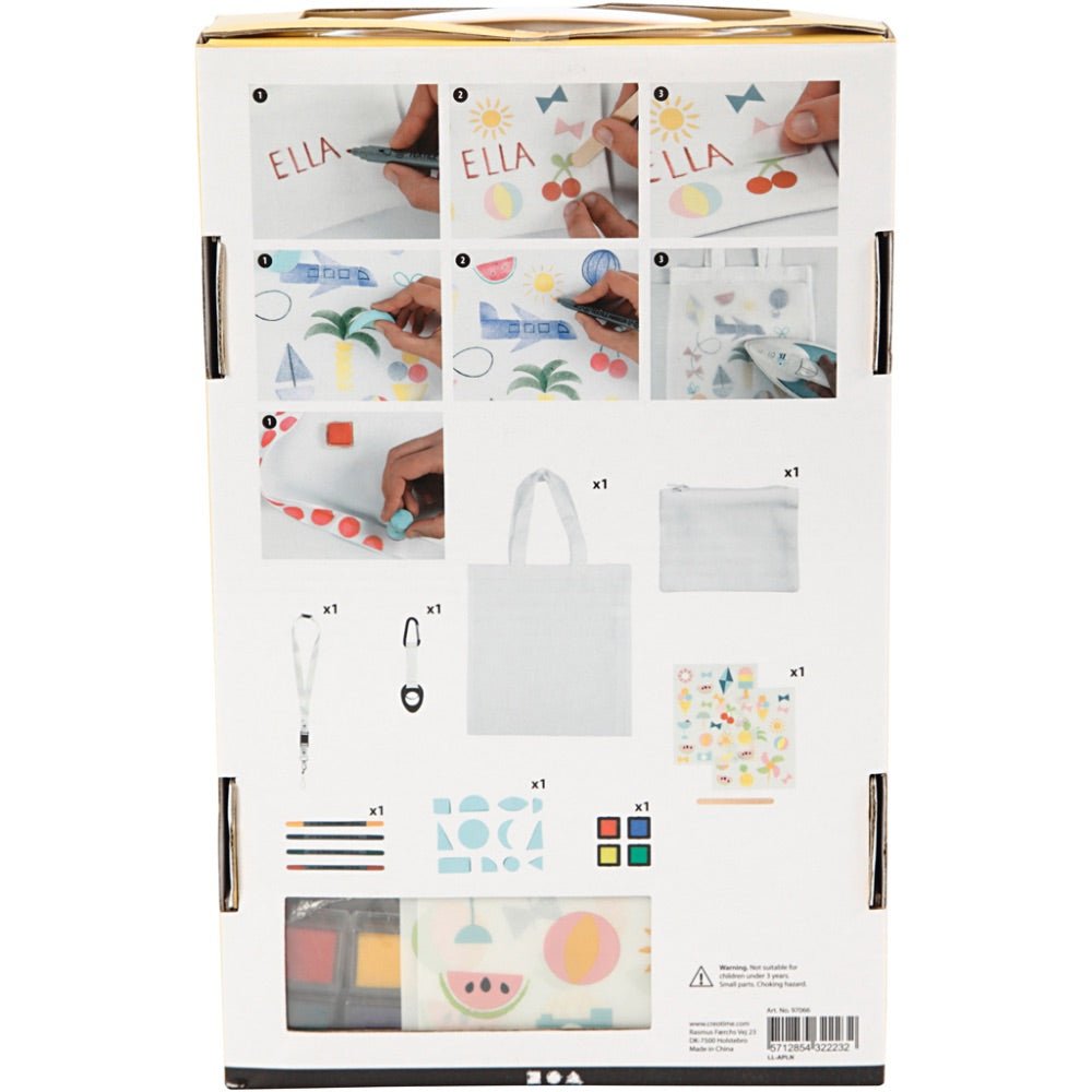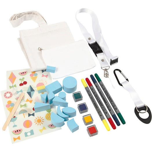 Contents: 1 lanyard, 1 bottle holder, 1 bag, 1 purse, Colortime textile marker, combination stamps, stamp colors and rub-on motifs.