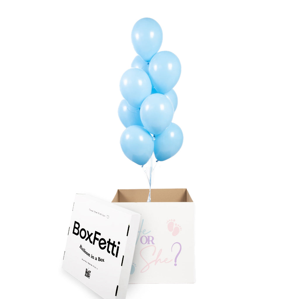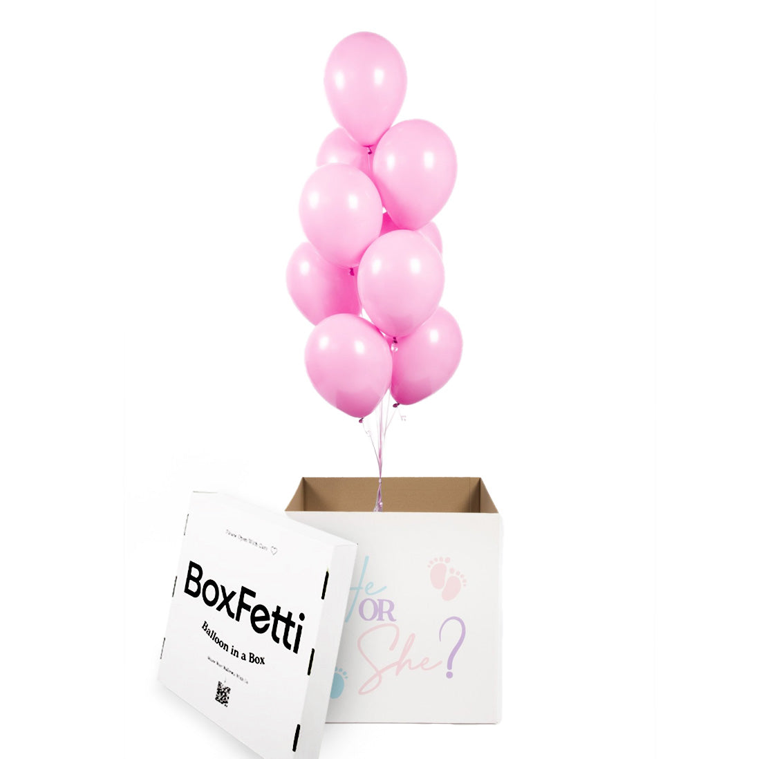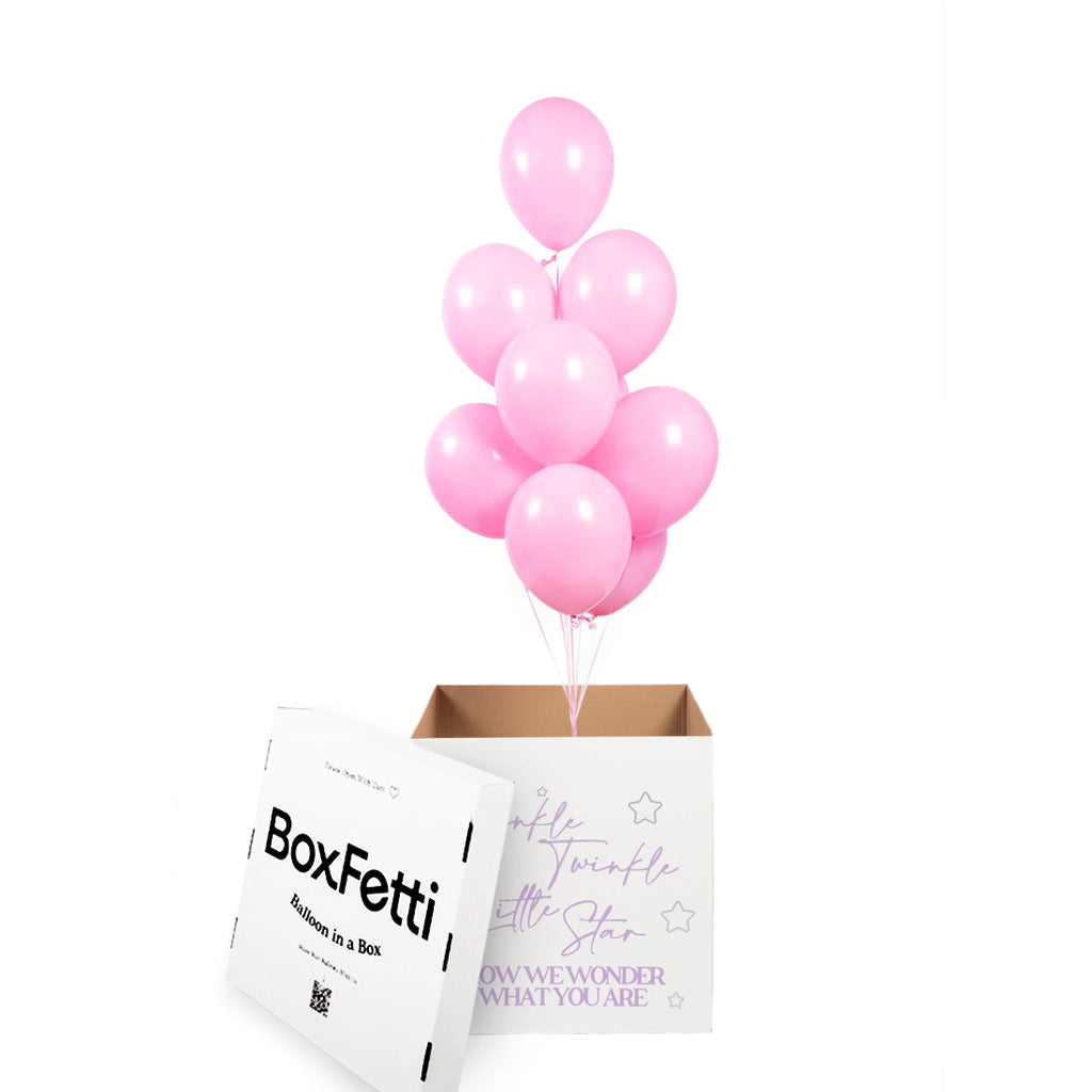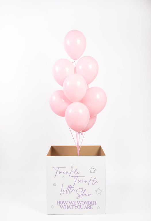 One Boxfetti Box containing 9 helium filled latex balloons in pink or blue.