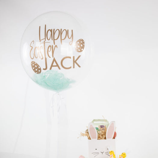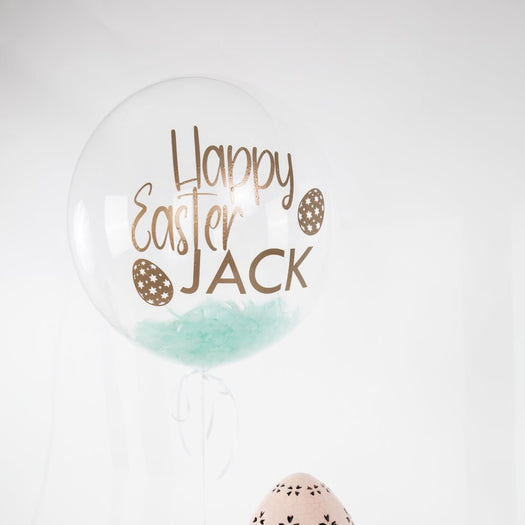 Clear bubble balloon with mint feathers, personalised message and matching ribbon.