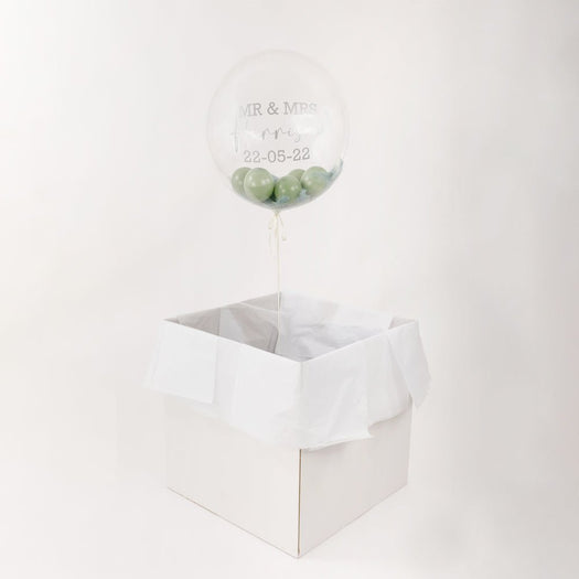 Clear bubble balloon with sage mini balloons and feathers, personalised message and matching ribbon.