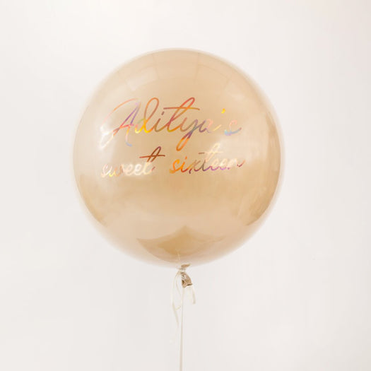 Clear bubble balloon with a sand latex balloon inside, personalised message and matching ribbon.