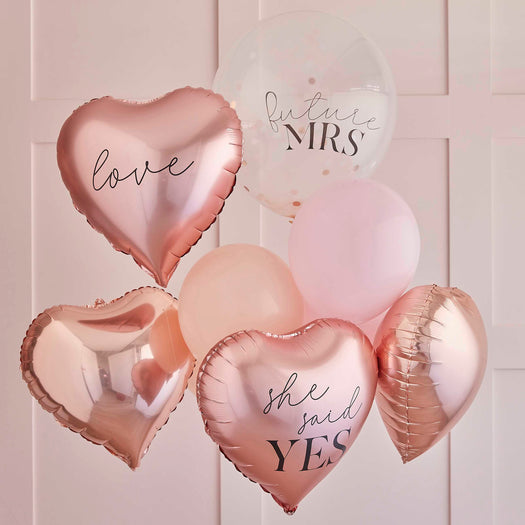Gorgeous and timeless, this cluster of hen party balloons will make it a party to remember! Perfect as hen party decorations, for an engagement party, or as a gift to a friend who just got engaged, this mixed pack of 9 engagement balloons make the perfect party backdrop. Slogans include 'She Said Yes', 'Future Mrs' and 'Love'. Team the balloons with other lovely hen party decorations from our Blush Hen party range for the perfect hen party setup.