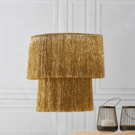 If you're looking for a stylish way to add shimmer and shine at a party or to decorate a special part of your home, then you'll love this gorgeous gold glitter chandelier. Beautifully crafted from shimmering tinsel, with velvet and cord detail, it'll add sparkle and shine.