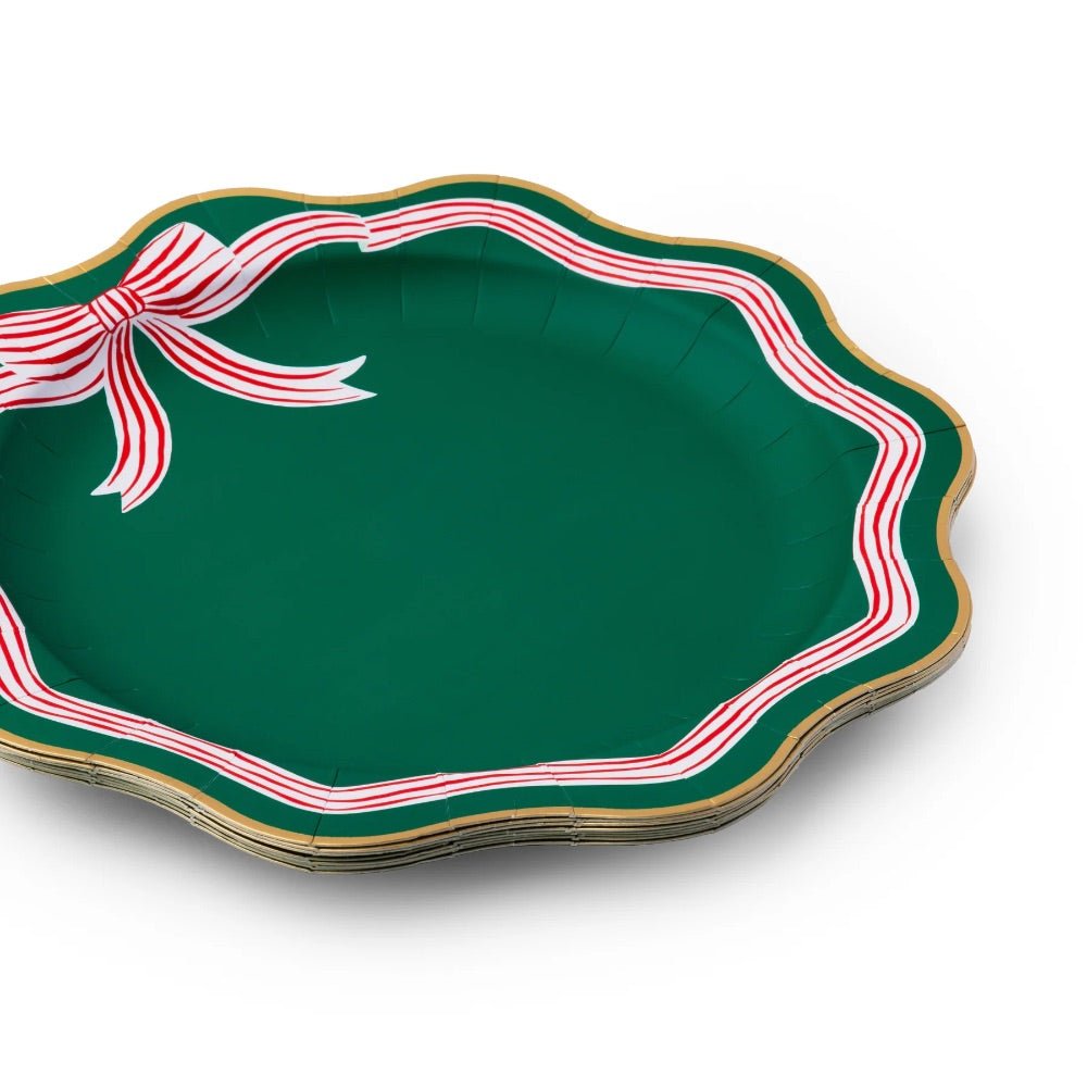 Add a hint of sophistication to your Christmas party table with these Elegant Green Peppermint Bow Dinner Plates. Adorned with a red peppermint striped bow and whimsical scalloped edges, these plates will effortlessly enhance any place setting and give off the illusion of chic china.