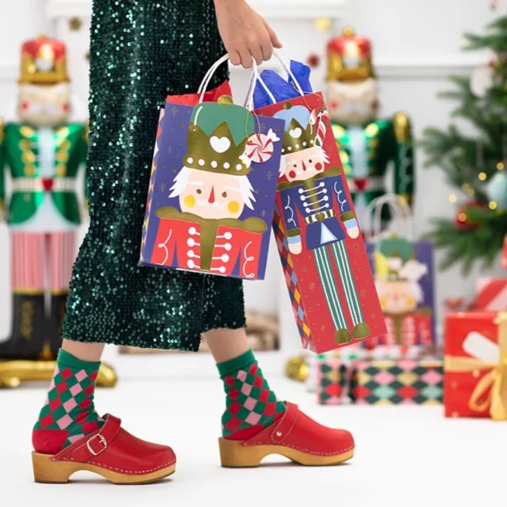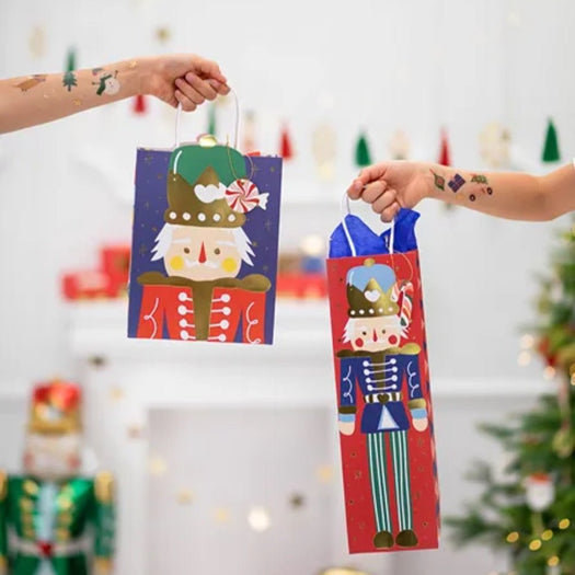 Spread holiday cheer with this Nutcracker gift bag with metallic print. Make unwrapping as joyful as the season itself!