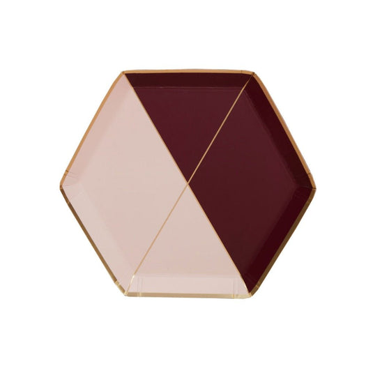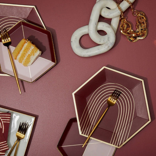 Bold yet understated, our maroon and pink hexagon party plates are adorned with delicate gold lines and are perfectly made for baby showers, wedding events, milestone birthdays, special occasions and holidays!
