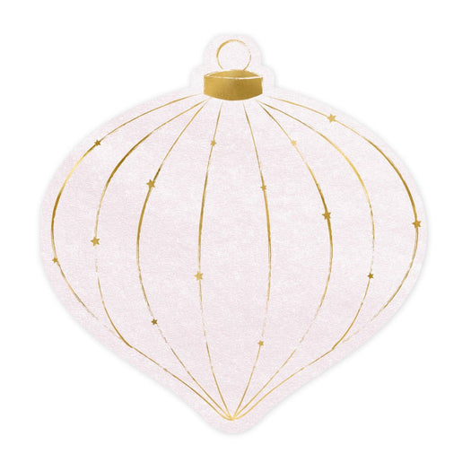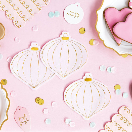 Paper napkins shaped as a Christmas bauble in pink with gold metallic print.