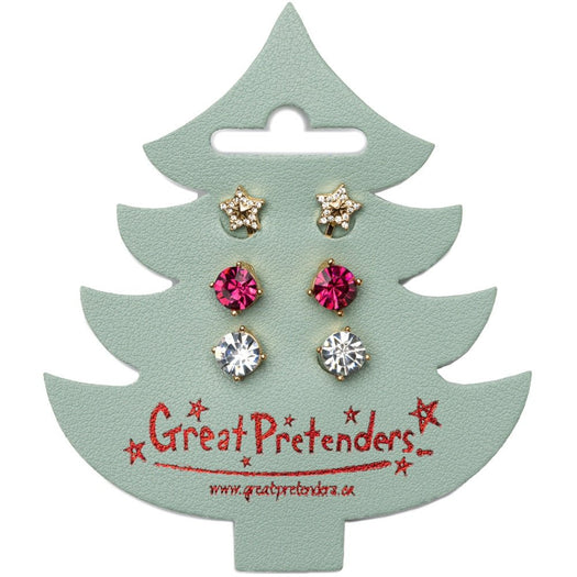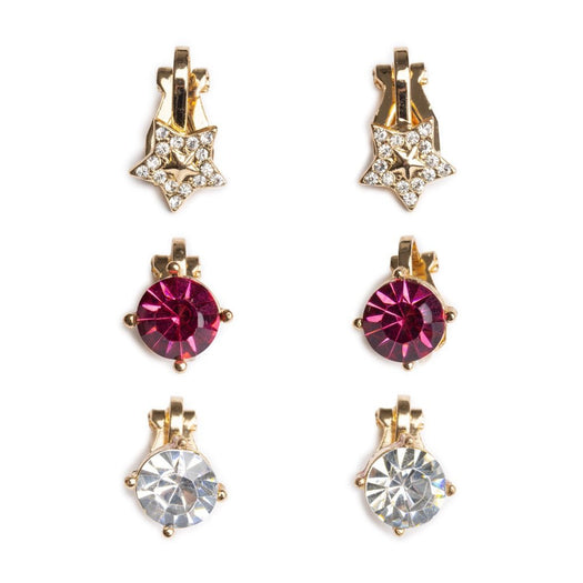 This set includes a pair of red gemstone earrings, a pair of diamond earrings, and a beautiful pair of rhinestone star earrings