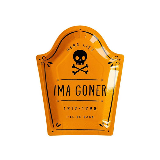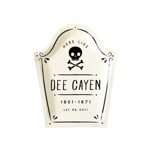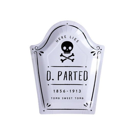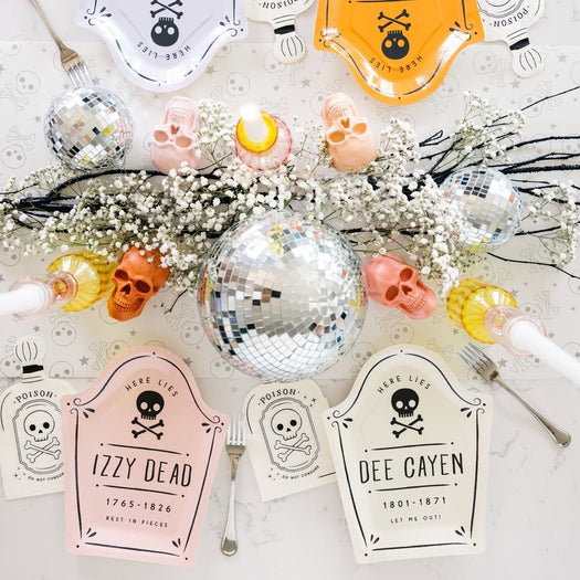 Halloween table decor doesn't need to be drab and gloomy, make it whimsical and bright with these shaped tombstone paper plates. Featuring punny epitaphs including: "Izzy Dead," "Dee Cayen," "Ima Gonner," and "D. Parted," these party plates are sure to set a frightfully fantastic scene at your Halloween table this year!