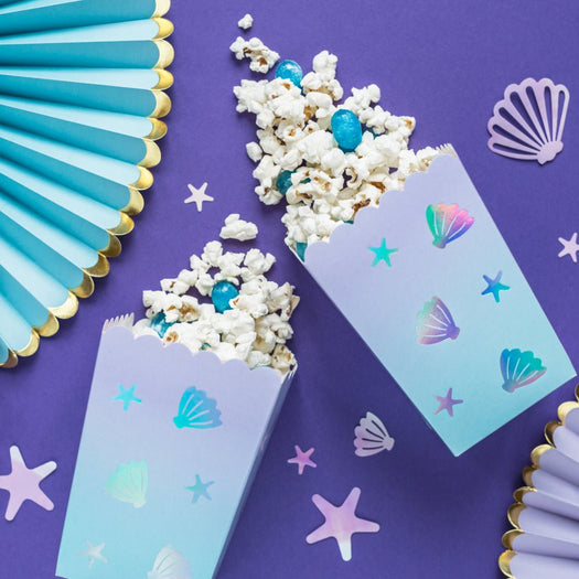 Boxes for popcorn in Ombre colour featuring iridescent sea illustrations.