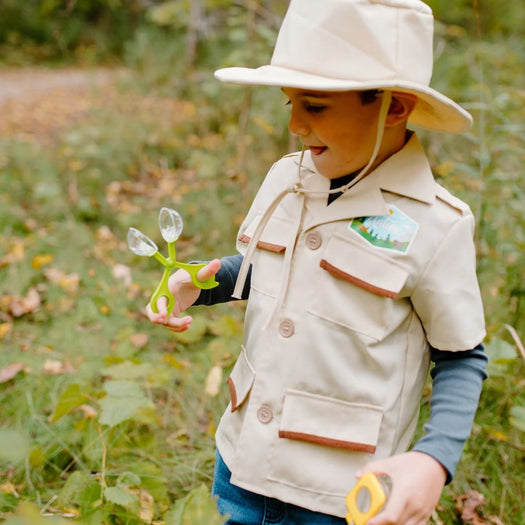 Set includes a khaki button-up shirt, a khaki safari hat, vibrant green binoculars, a magnifying bug jar, and bug catchers!