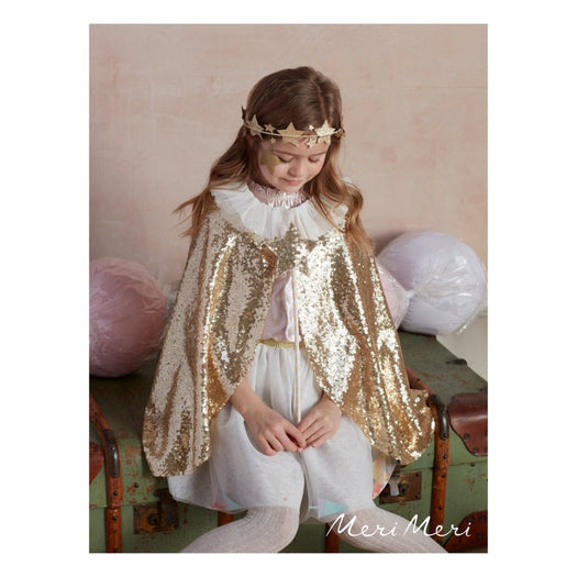 This gorgeous gold cape is a fabulous way to look extra special for any party or celebration. It's also ideal for imaginative play on any day. It's beautifully crafted from a lined gold sequin fabric, with an elegant white tulle collar. It comes with a gold sequin star wand, perfect to majestically wave around.