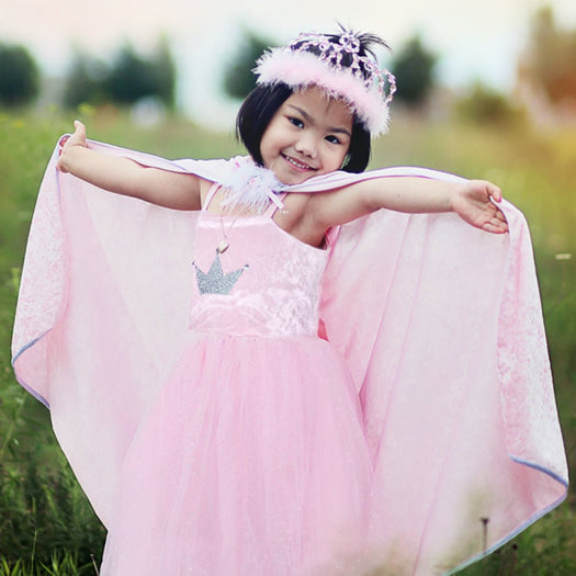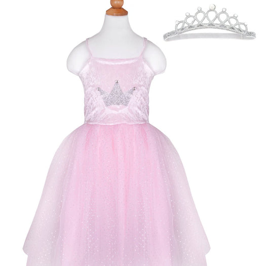 Made in Canada this Great Pretenders® classic Princess Dress is not only adorable but comes with a tiara! This two-piece set features a beautiful pink sparkle tulle dress, with a heat-sealed princess crown emblem embellished with gems.