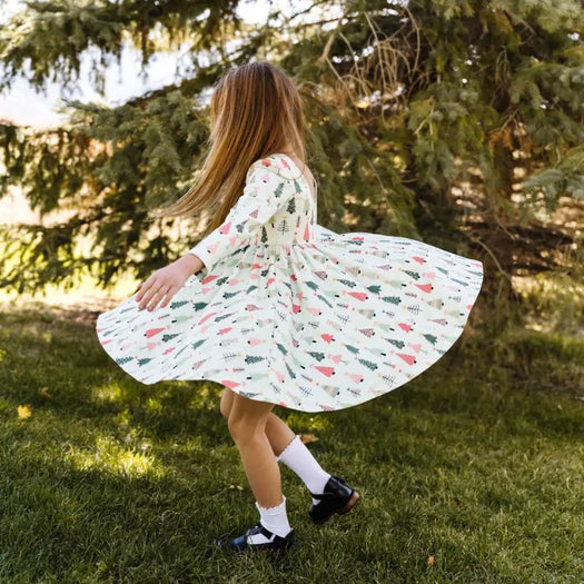 A classic ballet inspired twirl dress in extra soft and stretchy fabric with side seam pockets, double lined bodice, scoop back, full length sleeves and a full circle skirt for maximum twirls!