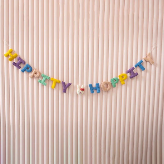 Hippity Hoppity into our daisy filled garden! Decorated with handmade garlands, gingham patterns, picnic lunches and white little bunnies. A magical and fun filled party awaits! Your guests will love this sweet handmade felt banner and you can use it year after year.