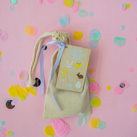 DetailsThis set contains 8 Easter themed wooden disks, packaged in a fabric drawstring bag with swing tag