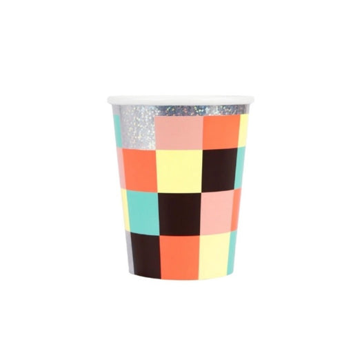 Pixelation perfection! Level up your games party with these paper cups featuring a retro checkerboard design and a sparkly silver holographic foil border. Both practical and decorative, they're perfect for adding a hi-tech look to your table. Ideal for serving hot or cold drinks to kids, teens and adults alike!