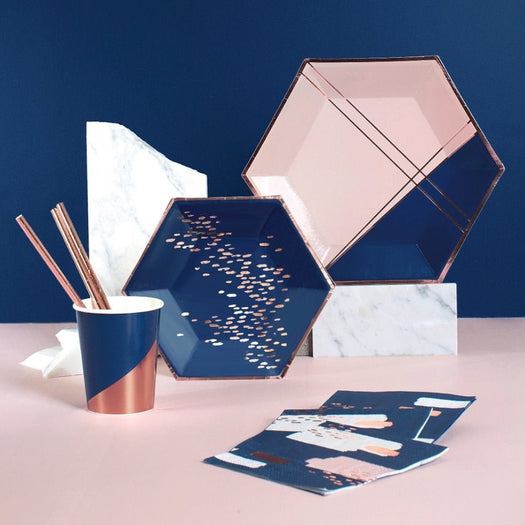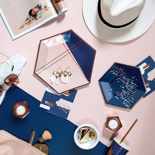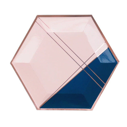 A modern, graceful color palette inset with fine rose gold trim, elevate your party with our colorblock hexagon party plates. Perfect for bridal showers, special birthdays, or gender reveal parties!