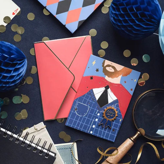 Card in mix of colors with gold metallic print and Super Dad enamel pin
