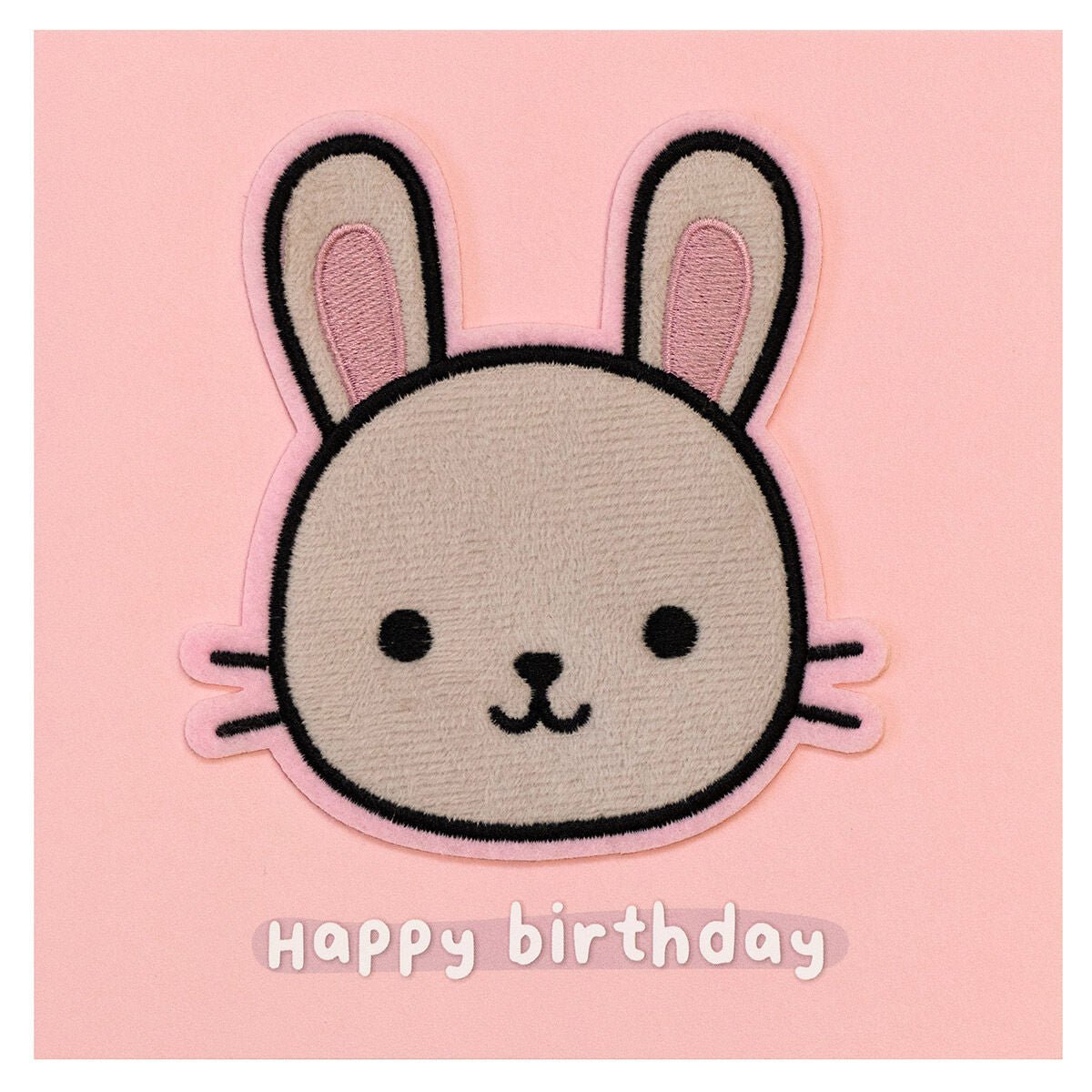 The card is pink with white text that says, ‘Happy Birthday’, and features a reusable kawaii inspired Ruby Bunny Rabbit felt patch decorated with stitched details which looks simply adorable!