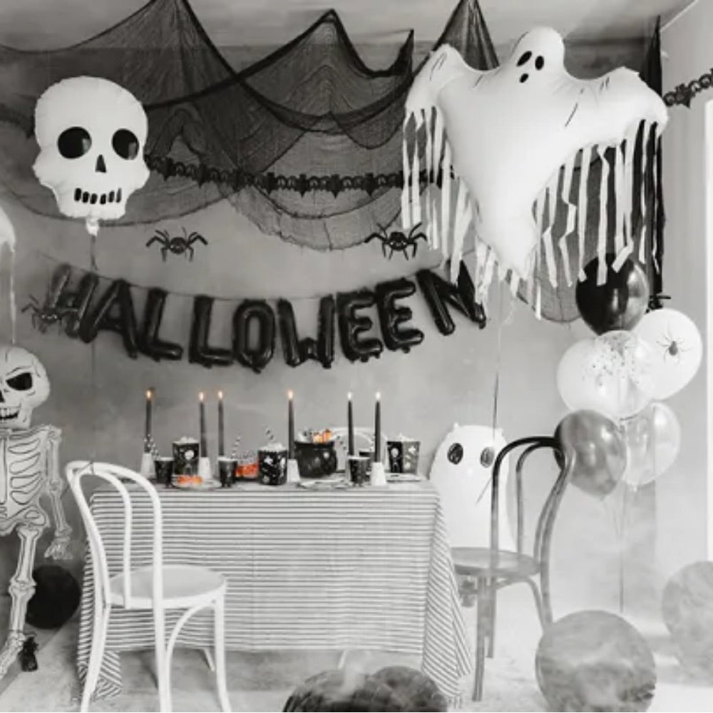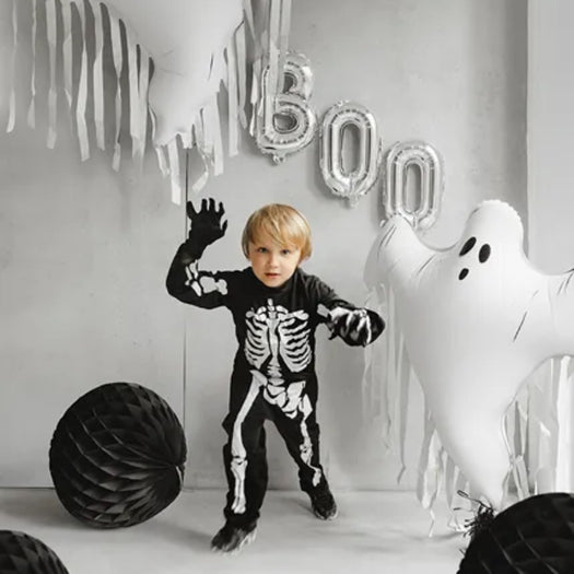 Add a charming and spooky flair to your celebrations with this Ghost Balloon with Tassels, measuring 93 cm for a standout decoration. This cream-colored foil balloon is beautifully accented with black details, giving it a playful yet elegant ghostly appearance.