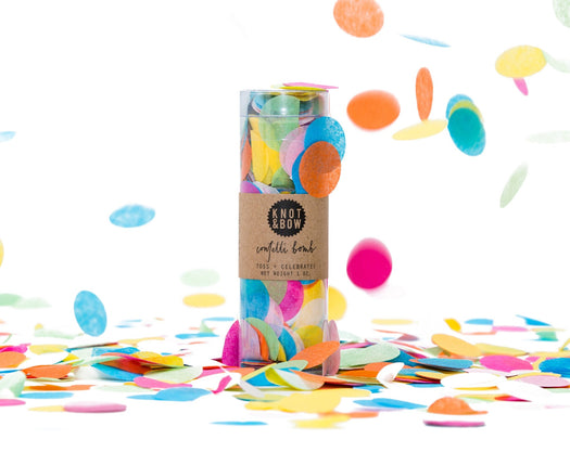 Ignite the party with Knot & Bow Confetti Bombs! This crystal clear tube is filled to the brim with party confetti, ready to toss, tuck into envelopes, or simply sprinkle on tabletops. Their confetti mixes are blended by hand, so each bomb will vary slightly.