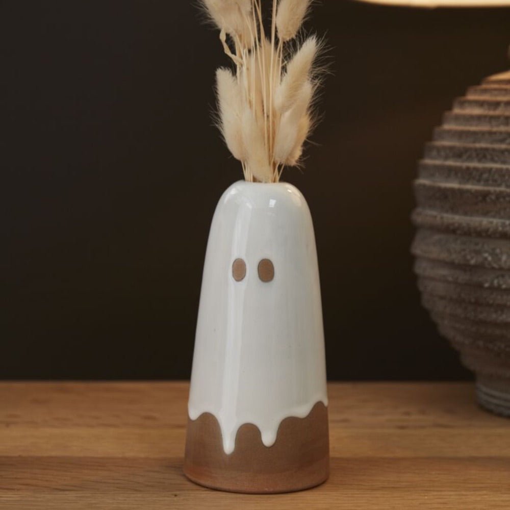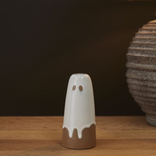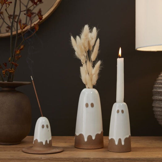 You’ve never seen friendlier ghosts than those in the Ghosted Collection. This whimsical group, made from brown clay, features glossy, ghost-like designs in a drippy white glaze with natural bisque accents. Whether it’s the delicate budvases, perfect for a few stems, or the unique incense holder with a wide base for catching ash, each piece adds a touch of charm to your Halloween decor.
