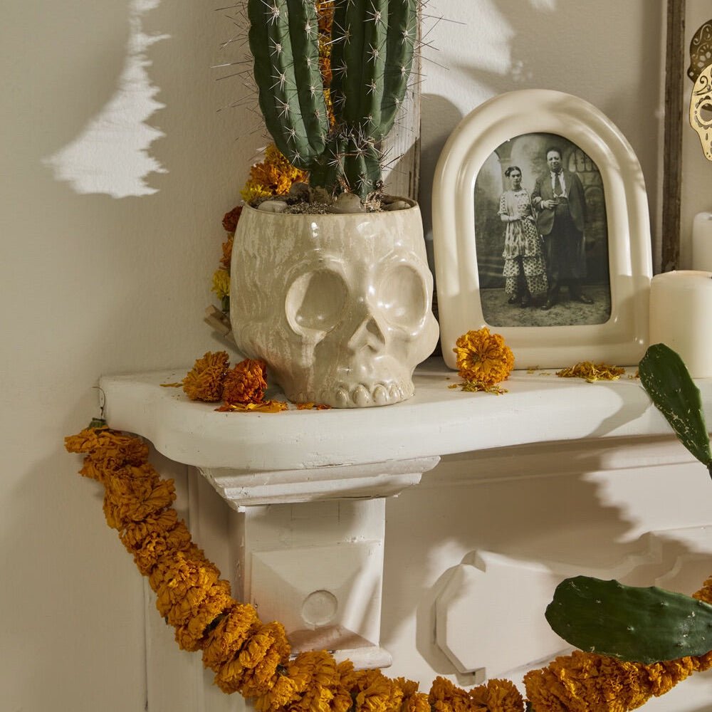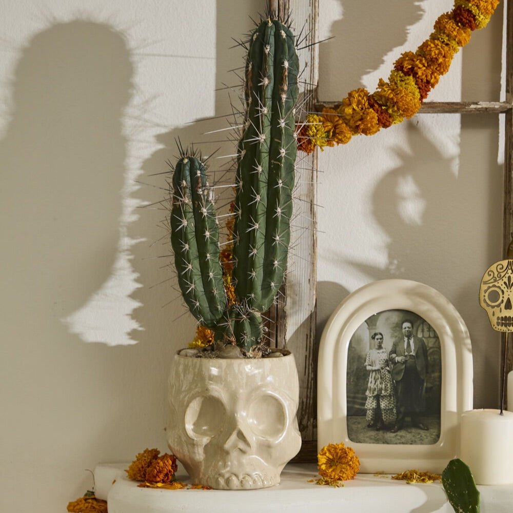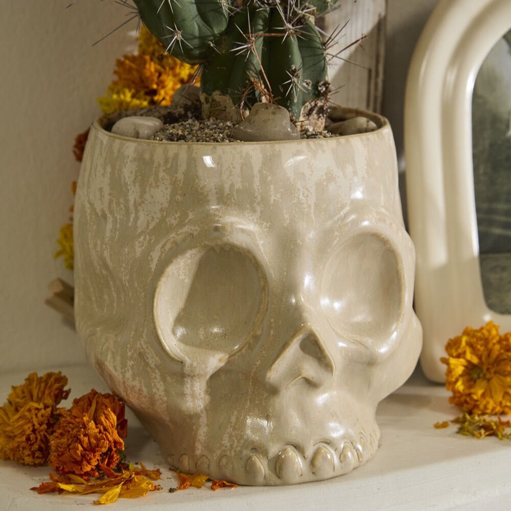 Add a bit of spine-chilling decor with the Haunting Skull Pot. With an off-white reactive glaze on ceramic, the Haunting Skull Pot can hold a 5-inch drop in plant. Dimensional details and a unique finish make this pot perfect for displaying plants or eerie florals that have been waiting all year to show their spooky vibes.