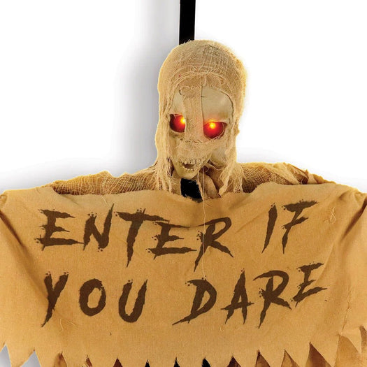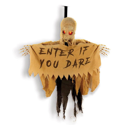 As the shadows lengthen on Halloween night, the Mad Toys Spooky 39-Inch Hook-Over Animated Mummy hangs ominously by your door, inviting only the bravest souls to approach. Wrapped in worn-out brown linen cloth, this mummy holds a tattered banner that ominously reads ""Enter if You Dare."" With creepy eyes that light up and glow, he’s not just a decoration—he’s a warning of the fright that lies beyond.