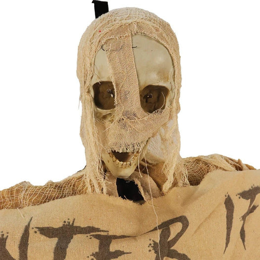 This mummy isn't just hanging out; he comes to life with sound and action. As guests approach, the responsive sensor activates his spine-tingling sounds, creating an immersive atmosphere that will send shivers down their spines. The light-up eyes enhance his eerie presence, making it clear that this mummy is ready to bring the horror right to your doorstep.