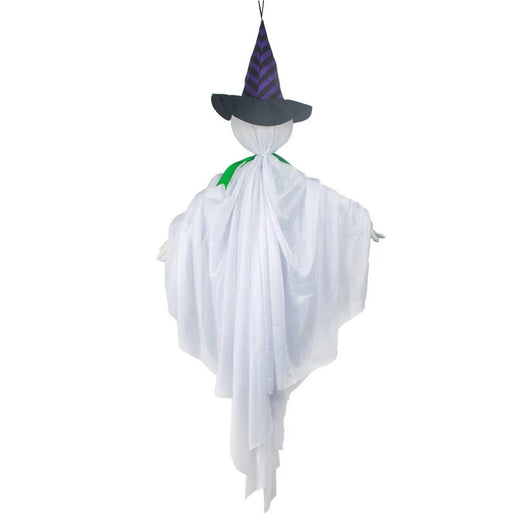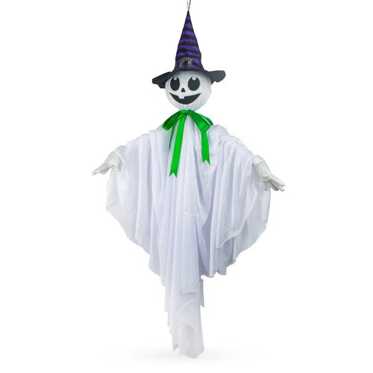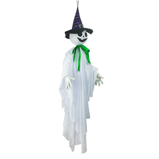 On a moonlit Halloween night, the Mad Toys Spooky Animated Hanging Dancing Ghost sways and dances in the cool autumn breeze. Dressed in a purple and black striped witch hat, a green bow, and a creepy smile, this ghostly figure beckons visitors with an outstretched, welcoming hand. Its sinister grin and playful attire create a perfect blend of spooky and whimsical, making it a hit with trick-or-treaters and party guests alike. Activated by sound, the ghost springs to life with ghoulish movements and eerie sounds that fill the air. Whether it's hung in a doorway, tree, or porch, this dancing ghost adds a touch of animated fright to your Halloween decor. Battery-operated for convenience, it’s easy to set up and enjoy the Halloween season.