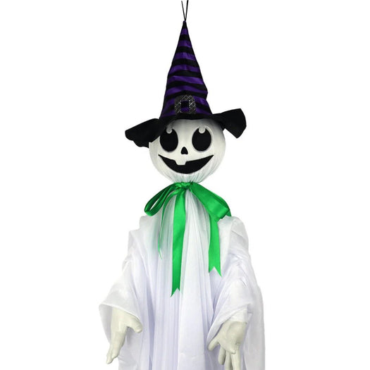 Spooky Features: Charming Yet Creepy: The ghost's white flowy dress, purple and black striped witch hat, green bow, and creepy smile create a unique and spooky character. Sound Activated: Comes to life with sound-activated shaking movement and eerie noises such as creepy with laughter & ghost howling sound, enhancing the Halloween atmosphere. Animated Movements: The dancing motion and welcoming hand gesture add a playful yet eerie touch to your decorations.