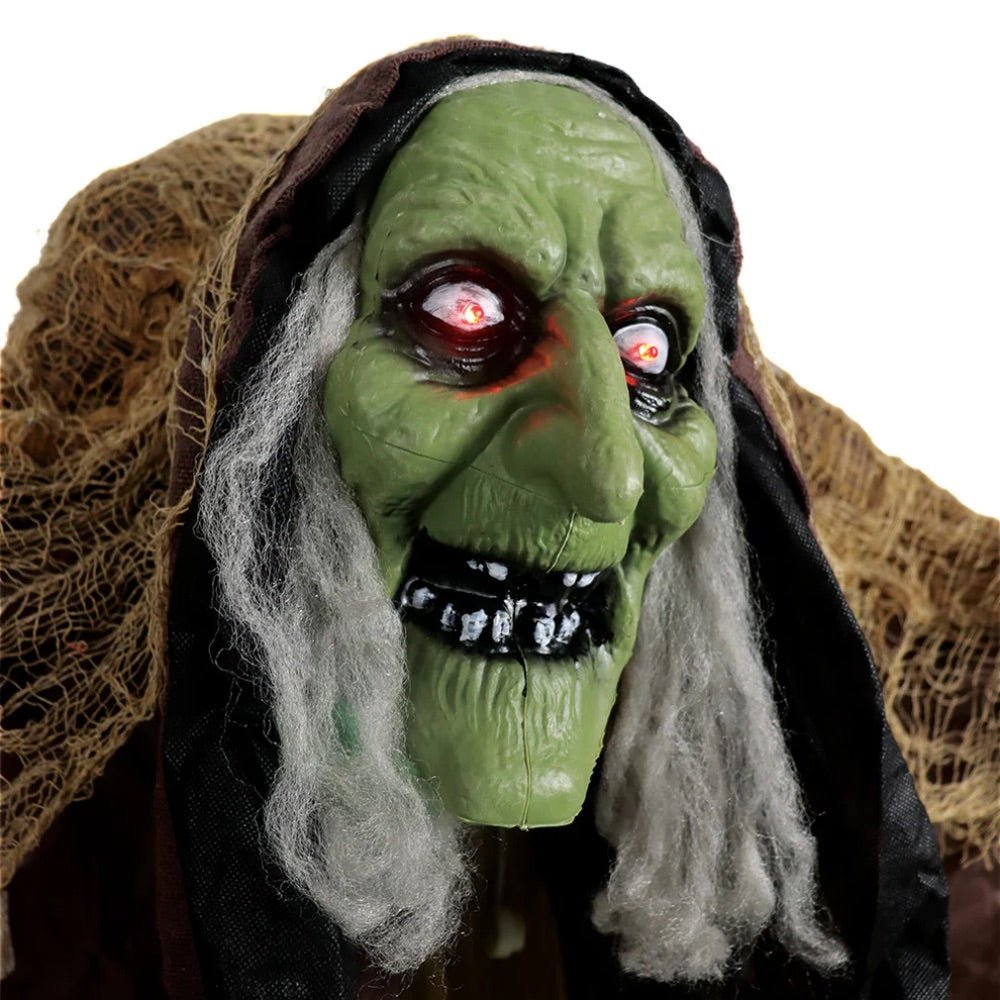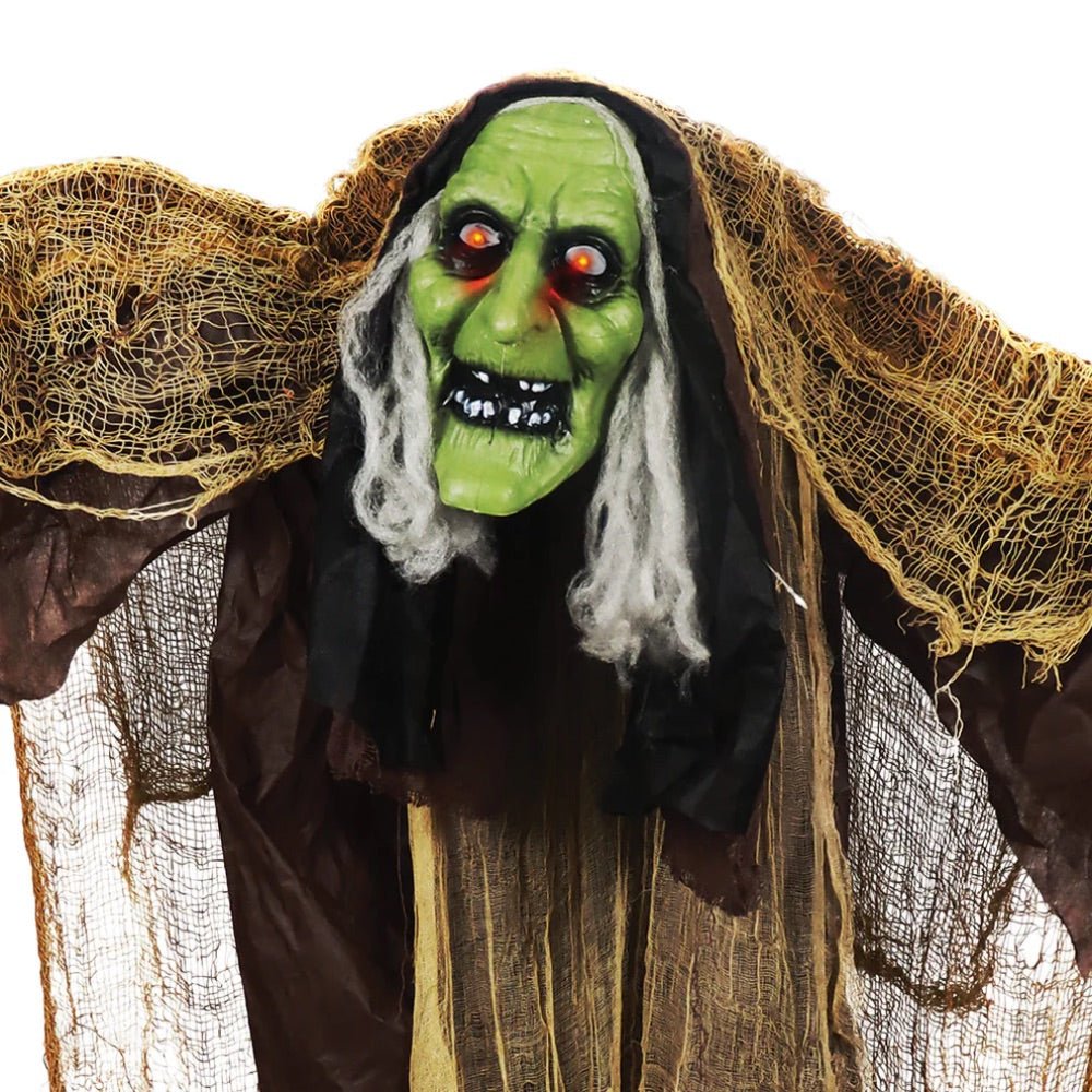 Spooky Features: Terrifyingly Realistic: The hunchbacked green witch, with her glowing eyes, ugly teeth, and long white hair, creates a disturbingly lifelike appearance. Light-Up Eyes: Her eyes glow with an eerie light, adding to the spooky ambiance. Sound Activated: This witch comes to life with sound-activated spooky sounds of a witch laughing & talking, creating an immersive Halloween experience. The witch also moves up & down with the sense of motion. This decoration is battery-operated and includes "try me" AA batteries (3 included) for immediate setup.