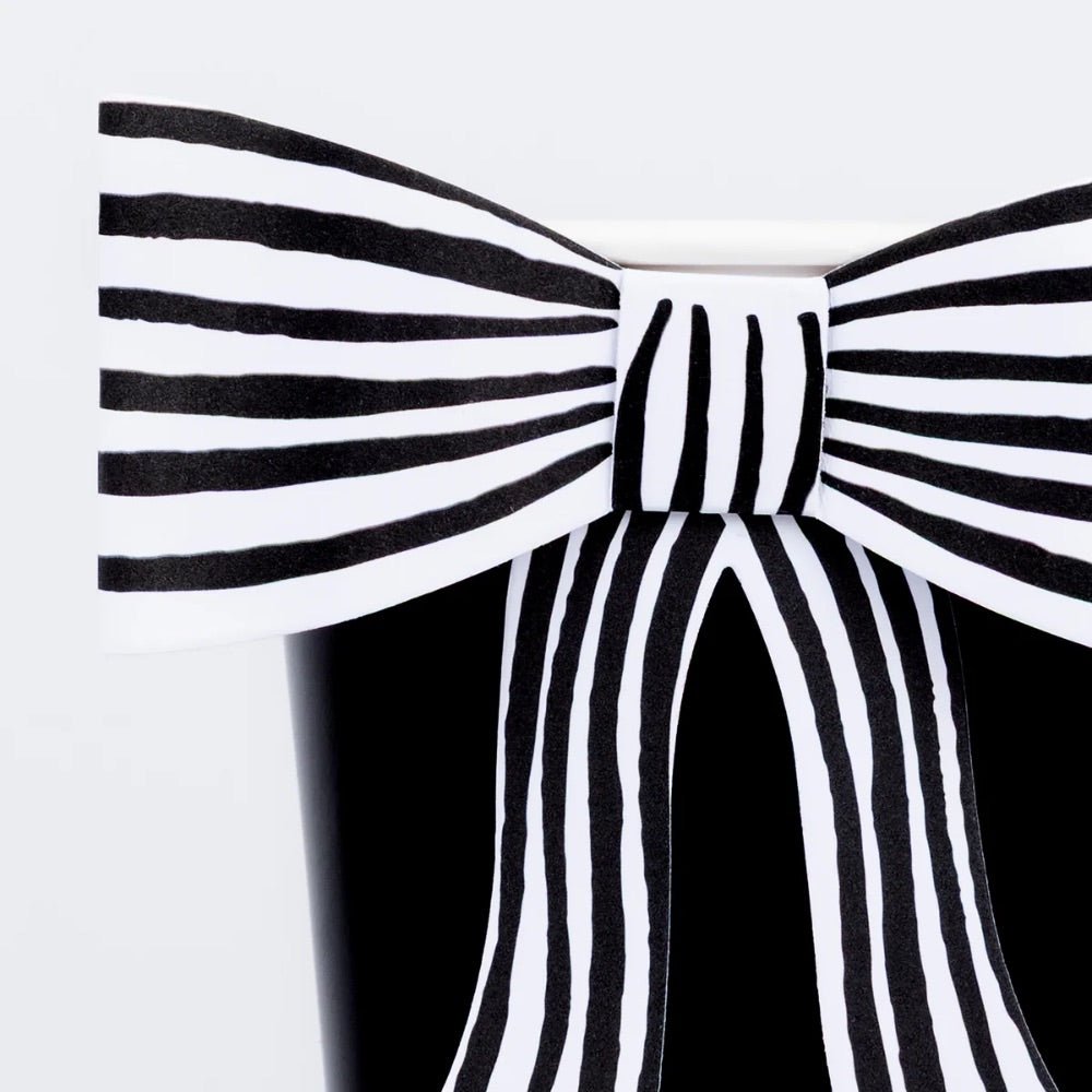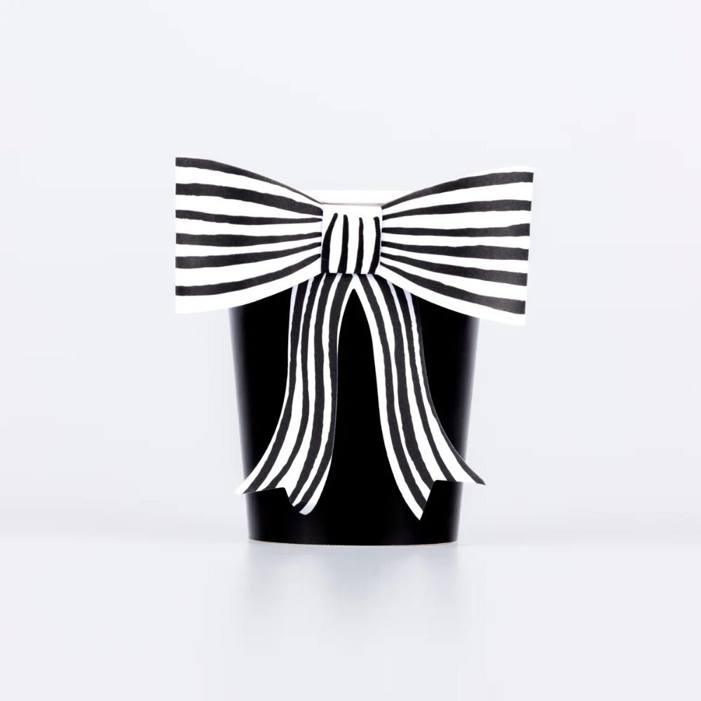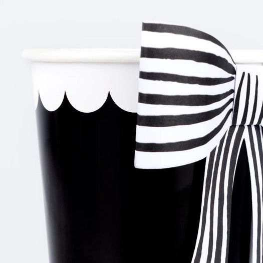 Thrill little witches and wizards with an elegant, eerily decorated Halloween party. These black cups, adorned with chic striped bows, add a spellbinding touch to your party drinks.