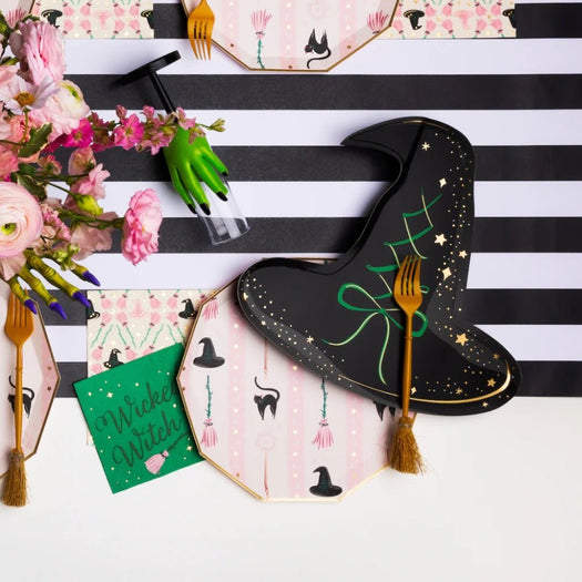 These Black Witch Hat Plates are an enchanting addition to any Wicked-themed party or Halloween celebration. The contrast of their black and emerald green colors adds a dramatic edge, making your table setting both festive and unique. Designed to complement our Witch Hat & Broom Large Plates and Wicked Witch Cocktail Napkins, they help create a cohesive and magical atmosphere that will captivate your guests. Perfect for serving treats or snacks, these plates bring charm and fun to your event, ensuring your Halloween soirée is truly spellbinding and memorable.