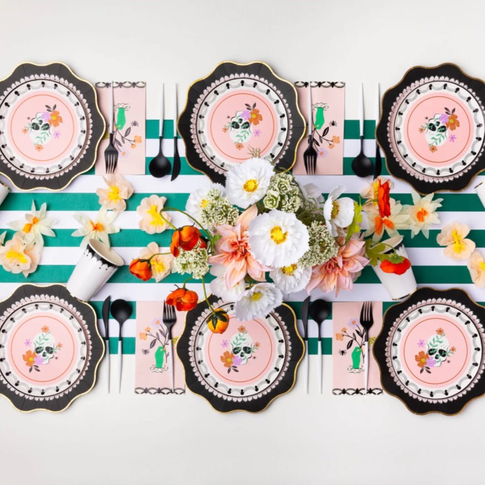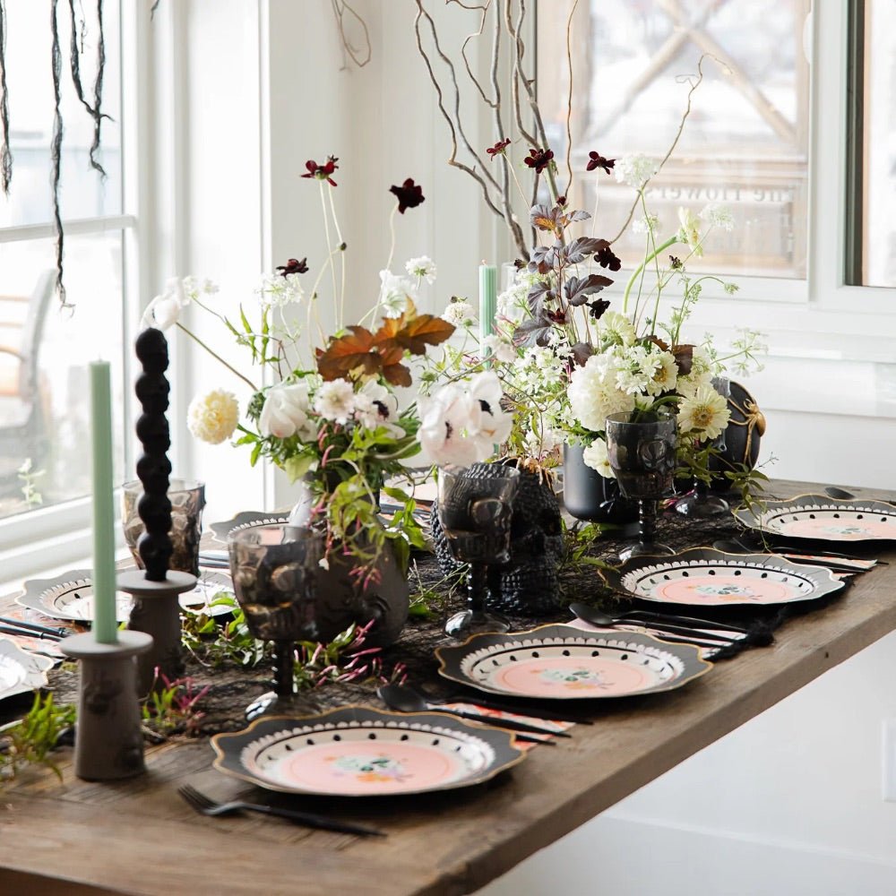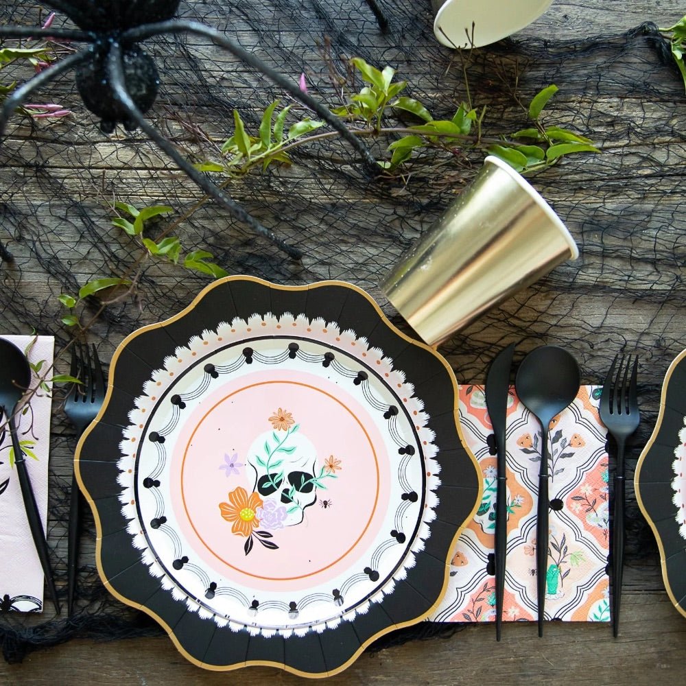 Elevate your Halloween dinner party with our Floral Halloween Skulls & Spiders Dessert Plates. These elegant small plates feature shiny black foil spider detailing and pops of pink, along with a spooky chic skull and florals. Add a touch of eerie sophistication to your haunted house party this season!