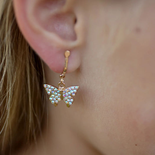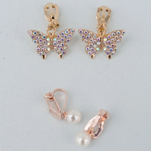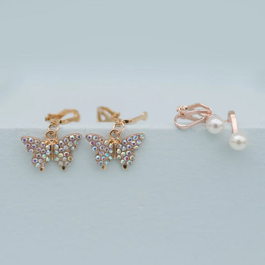 These drop-style clip-on earrings are made for children with unpierced ears. This set comes with a rhinestone-encrusted butterfly style and an elegant pearl style, made with rose gold-colored metals. Perfect as a gift or as stocking filler!