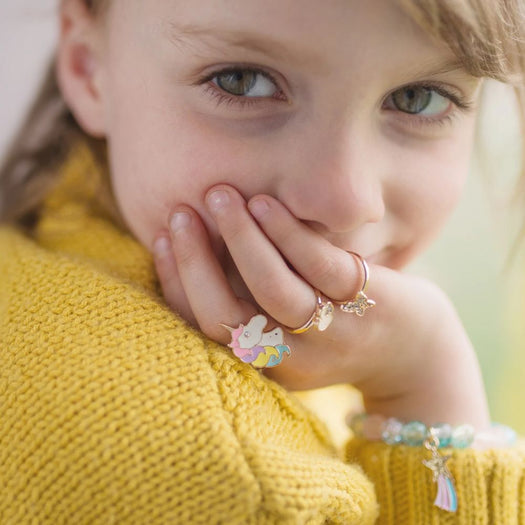This Boutique Butterfly & Unicorn ring set is made to fit child's fingers with size adjustable features. This beautiful set is made with rose gold metals.