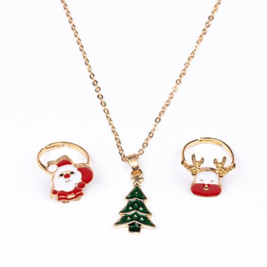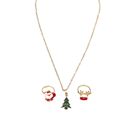 Add a little holiday bling with our Christmas Tree Necklace and Ring 3-piece set. This festively fun trio consists of two rings with Santa and reindeer designs and a gold chain necklace with a Christmas tree pendant.