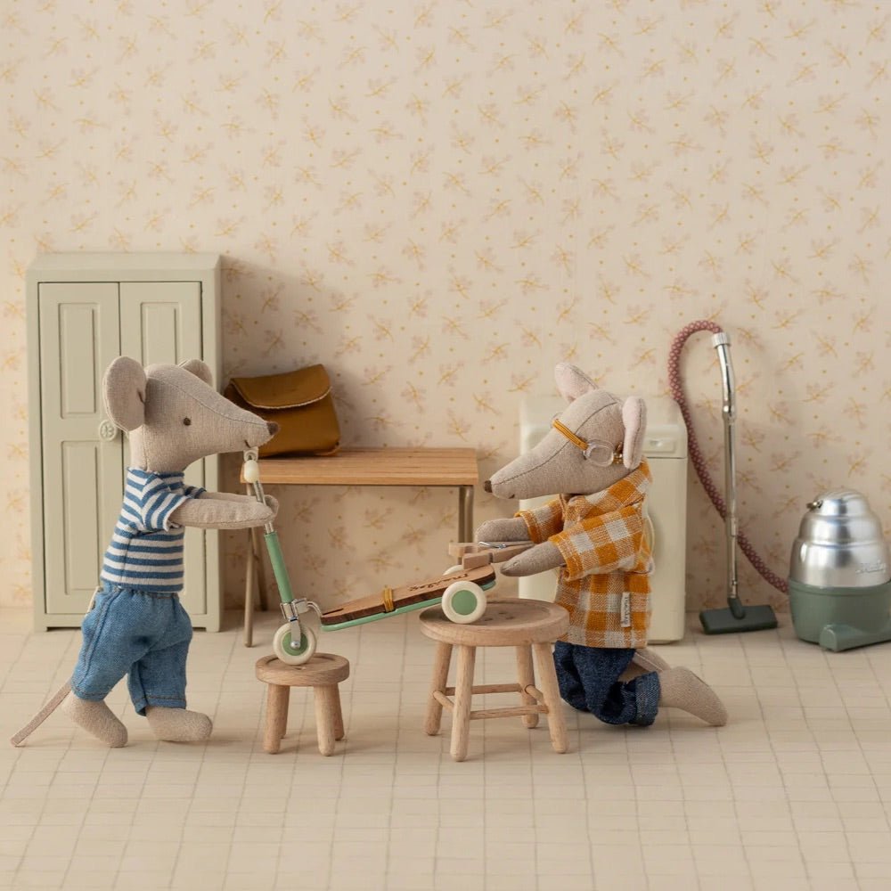 A kickboard with wooden details. The kickboard has a metal stick in the handlebars that makes sure mice with magnets in hands can stay on the board. A small elastic is added on the board and will secure the feet on the board during the ride.