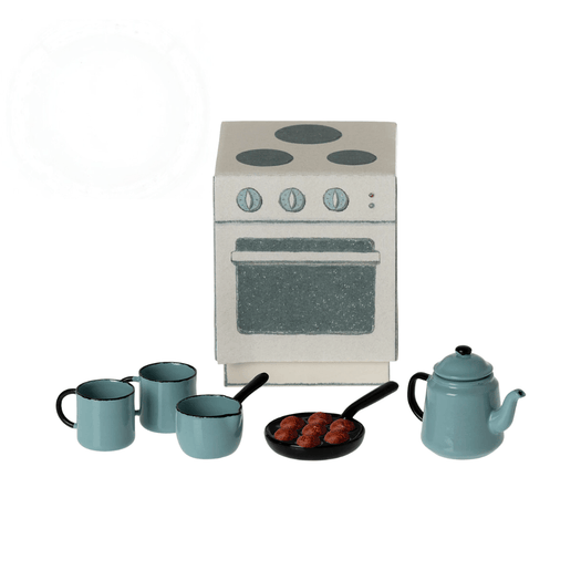 A miniature cooking set with all Madam Blue`s favorites. A can and two cups, a saucepan and a pan with delicious puff cakes which is a traditional scandinavian treat in the winter time. All these parts come in a paper box that looks like a stove.