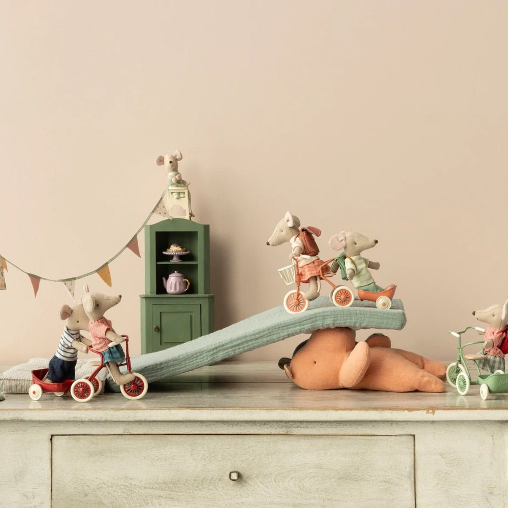 Big sister mouse is ready for a day in school, carrying her backpack on the back. She has magnets in her hands so she can hold the handles of the tricycle for a fast trip.