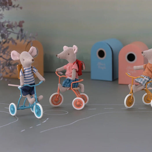 Big sister mouse is dressed for a day in kindergarten or school, carrying her backpack on the back. She has magnets in her hands so she can hold the handles of the tricycle for a fast trip. The tricycle is sold seperately.