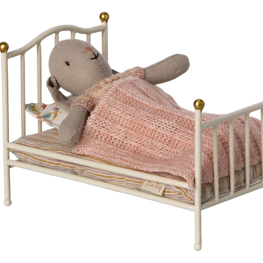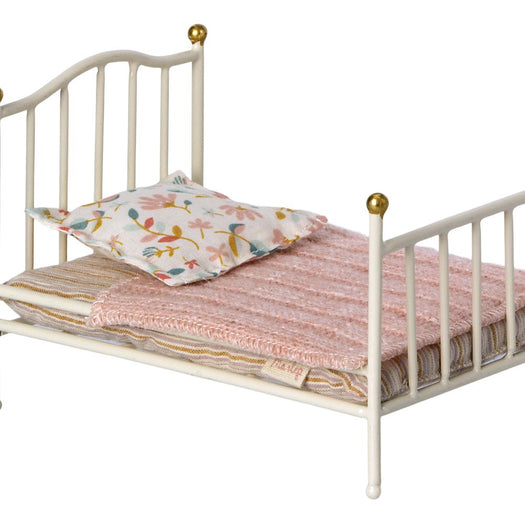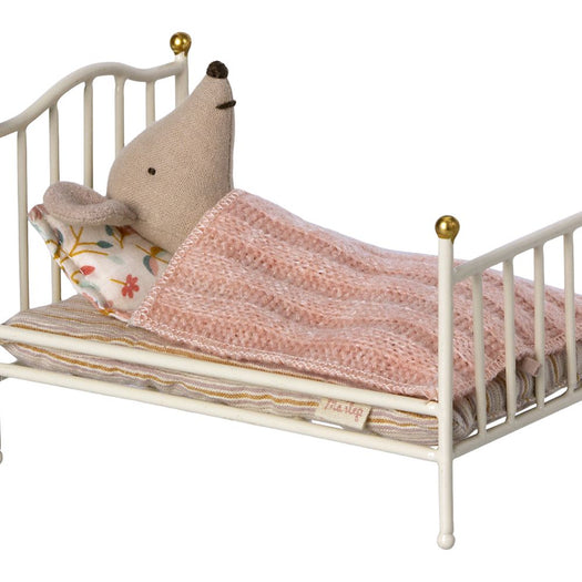 Let your Maileg friends have a sleep-over in the vintage metal bed. It comes with a mattress and pillow made in our beautiful Maileg printed fabrics. On top, a knitted blanket will keep the small friends warm. It fits the smaller mice perfectly.