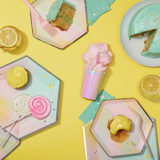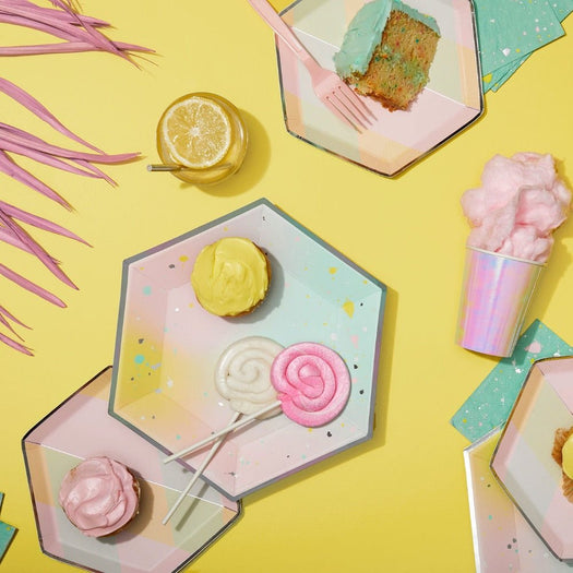 Celebrate your next birthday or social event with our Pastel ombre large paper plates! Shimmered with silver splatters and fun colors, wow your guests with an 80's themed party or aura-reading party at the park!