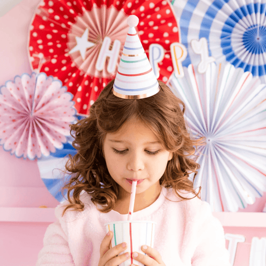 Get into the birthday spirit with these bright and cheerful party hats. From a little one's birthday bash to a grown up surprise party your guest will be delighted to party in these whimsical hats. And with a dash of gold foil they add just the right amount of sparkle to the day!