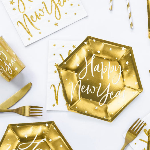Mirror gold paper plates with words 'Happy New Year' mixed with stars in white.