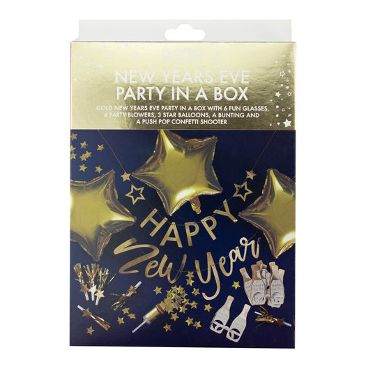 The perfect party in a box complete with all decoration items for your New Years Eve Party. Each party in a box contains; 1 bunting measuring 1.5m L 6 fun glasses 6 party horns 3 x balloons and 1 confetti push pop. Throwing a party has never been easier with our gold foiled New Years Eve Party in a Box. This party in a box is full with new years eve party decorations and has everything you need to throw the ultimate NYE party. Grab a box to decorate your party all in one.