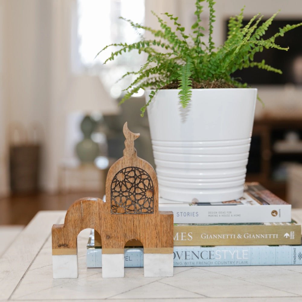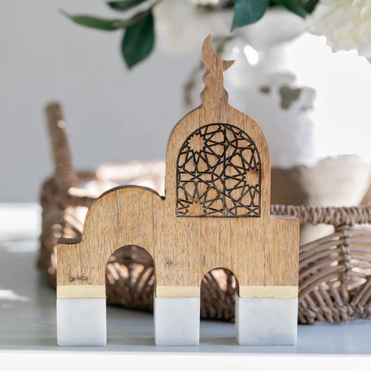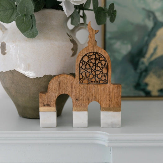 This minimal Masjid centerpiece combines two beautifully simple materials to create an elegant decor piece that will last for years. Hand-carved from mango wood, this modern Masjid silhouette emanates elegance. The warm wood is contrasted beautifully with the hand-cut marble. This piece will elevate any space whether it’s in your living room, on the mantle, or dining table decor.